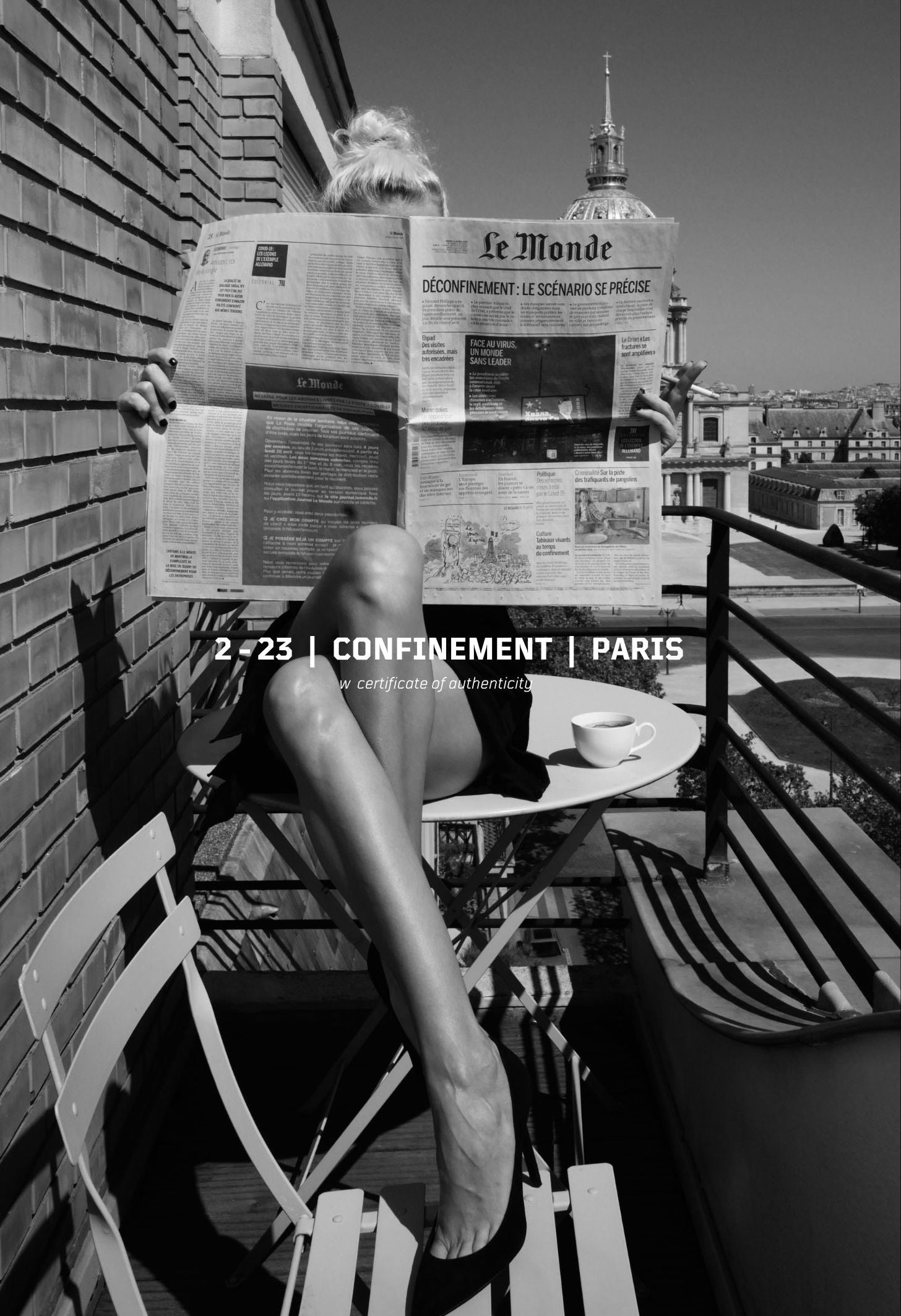 Morning coffee. The terrace of a private apartment on Avenue de Breteuil / VII arrondissement of Paris — suddenly transformed into a prison alley. Heels as a symbol of social life. A copy of Le Monde — the day’s predictions of liberation. Behind her: the golden dome of Les Invalides. And yet she sits, like someone waiting for a world that might never return. Or maybe just pausing in the quiet — nowhere to go, but still wearing heels. Every person on Earth in 2020 had their own Confinement. This was one of them.